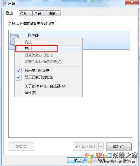 3、我们再用右键点击:扬声器,在弹出的菜单窗口,左键点击:启用;
