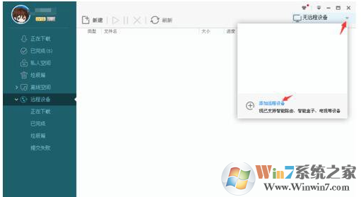 1、打开迅雷极速版下载,然后登陆迅雷账号,也可以先登陆,看一下面板下面有一项是远程设备,我的没有呢要去添加,这时可以看右上角点击无远程设备。