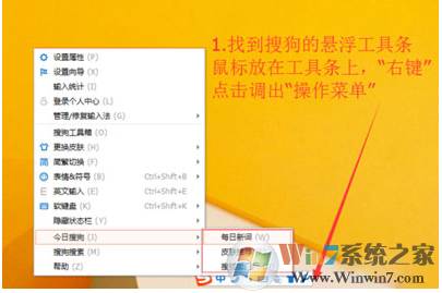 1、选择当前输入法:搜狗输入法;在桌面搜狗的悬浮工具条上,鼠标右键点击。调出修改菜单。