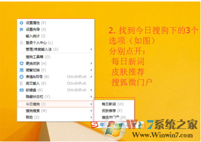 2、在修改菜单中,找到“今日搜狗”下边有3个小菜单分别是:每日新词、皮肤推荐、搜狐微门户 (这就是骚扰我们的3个广告弹窗了) ,分别点开这3个内容。