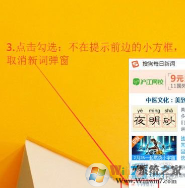 3、关闭搜狗每日新词:在弹窗的左下角,点击勾选—不在提示前边的选择框。即可关闭该弹窗再次弹出。