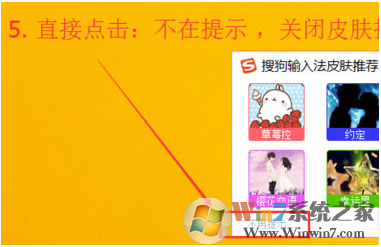 5、关闭输入法皮肤推荐弹窗:在弹窗的左下角,直接点击:不在提示。 关闭弹窗。