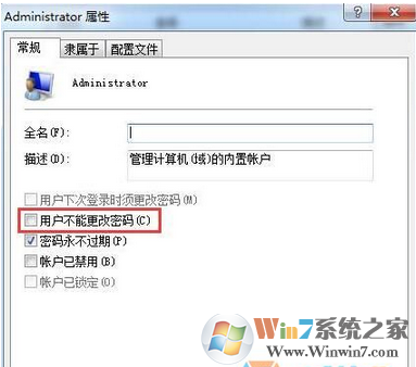 5、双击右侧的administration账号,弹出属性窗口,在这里把“用户不能更改密码”前的复选去掉,最后点击确定按钮保存退出。这样就可以在账号管理中修改用户的密码了。如图所示: