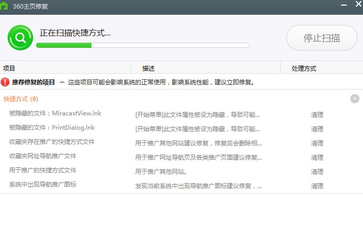 3、进入主页修复页面后选着扫描,会自动帮你清理那些主页修改小病毒