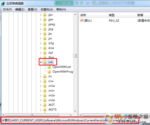 2、依次在注册表内找到HKEY_CURRENT_USER/SOFTWARE/MICROSOFT/WINDO WS/Currentversion/Explorer/FileExts/.lnk,如图;