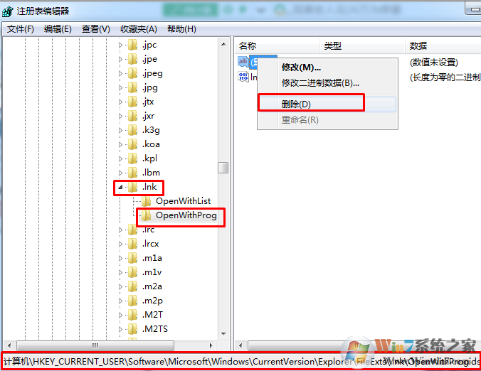 3、在.lnk下面我们能看到两个项openwithlist和openwithprogids,如果还有其他的项都删除,同时把这两个项内的子项删除,如图;