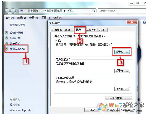 2、在出现的界面左侧选择“高级系统设置”→在弹出的“系统属性”界面选择“高级”→在性能栏目选择“设置”,如图5所示: