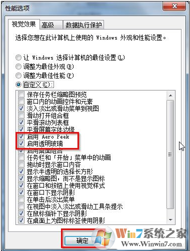 3、在“性能选项”中,将“启用Aero Peek”和“启用透明玻璃”前的勾取消→点击“确定”,如图6所示: