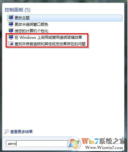 1、打开“开始”菜单,在搜索栏目中输入“Aero”,选择在“Windows上启用或禁用透明玻璃效果”或者“查找并修复透明和其他视觉效果存在的问题”。如图8所示: