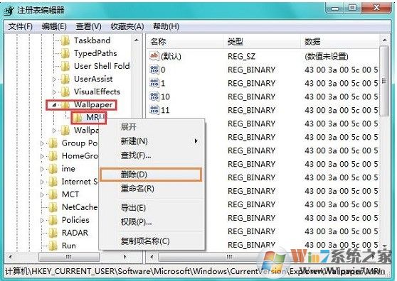2、依次找到以下位置:HKEY_CURRENT_USER╲Software╲Microsoft╲Windows╲CurrentVersion╲Explorer╲Wallpapers,只要删除里面的所有内容,按“F5”刷新;