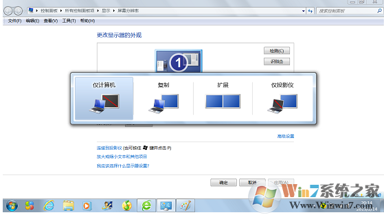 这时屏幕上会出现四个选择按钮。它们的功能含义分别只在笔记本屏幕显示、两个屏幕都显示同样内容、扩展屏幕就是两个屏幕内容合二为一、只在外接屏幕上显示笔记本屏幕关闭。我们经常使用的功能就是最后一个了。点击一下需要的按钮就设置OK啦!