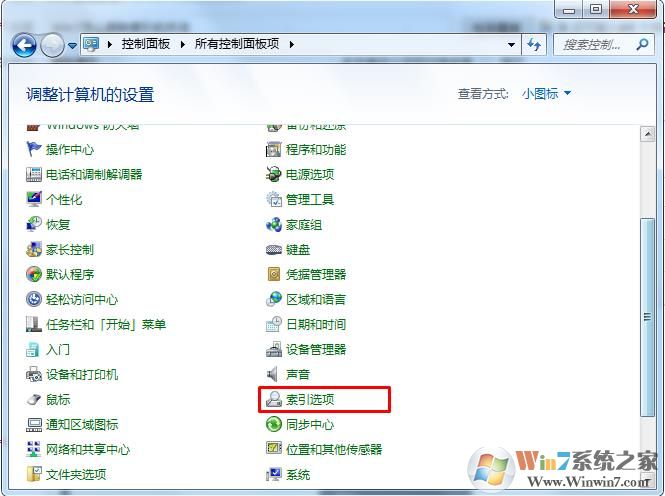 2、我们把控制面板的查看方式设置为小图标,然后点击索引选项;
