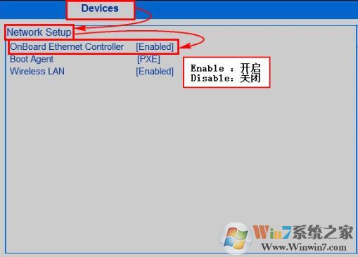步骤2、进入BIOS后,使用键盘左右方向键选中Devices菜单项,然后使用键盘上下方向键选中Network Setup选项按下Enter(回车键),即可找到“OnBoard Ethernet Controller”网卡开关选项,