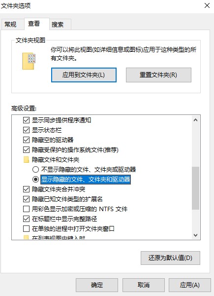 2、然后打开文件夹选项,在查看选项卡下,按下图设置,