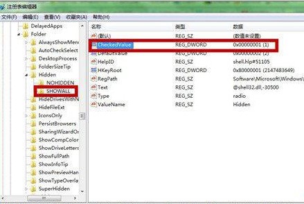 2、依次定位到HKEY-LOCAL-MACHINE\SOFTWARE\MICROSOFT\WINDOWS\CurrentVersion\EXPLORER\aDVANCEN\fOLDER\hIDDEN\SHOWALL路径,点击“SHOWALL”在其右侧窗口中找到“checkedValue”;