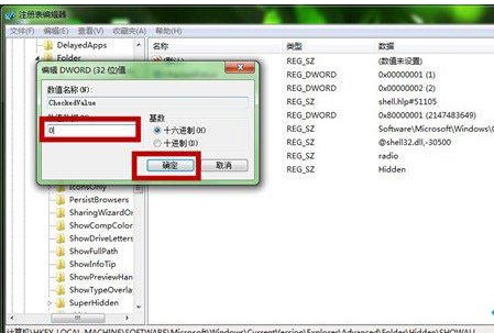 3、鼠标双击“checkedValue”,在弹出的窗口把它的键值1改为0,再关机重启即可;