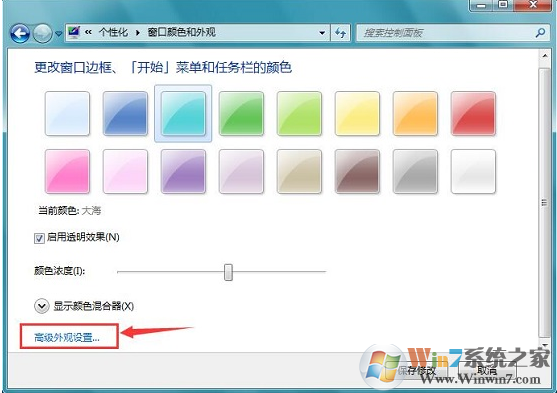 2、打开“窗口颜色”,然后点击左下方的“高级外观设置“;