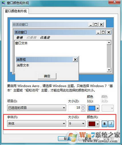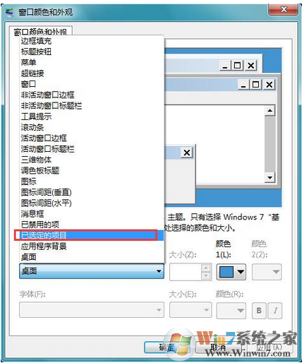 3、在窗口颜色和外观界面中,点击“项目”里的桌面,选择“已选定的项目”;