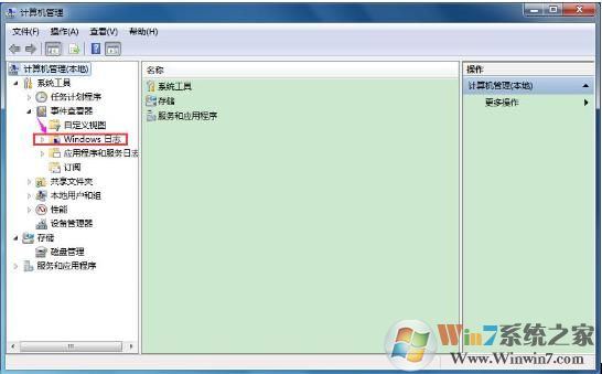 2. 接下来在左侧点击“事件查看器”,然后点击“Windows日志”: