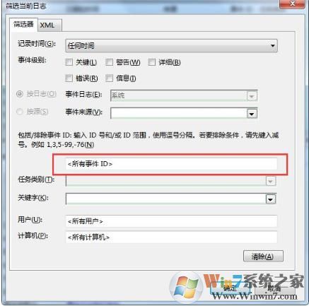 4、双击“筛选当前日志”,在图中红框处输入你需要查找的事件ID,中间用“,”隔开: