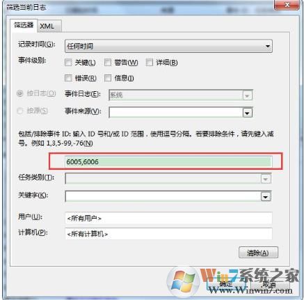 5. 比如我们要查看电脑近段时间的开关机时间,ID6005表示事件日志服务已启动,即开机。ID6006表示事件日志已停止,即关机,那么就在输入ID处输入“6005,6006”,点击确定: