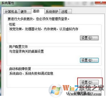 2、此时在弹出的系统属性窗口中,切换到高级选项卡,点击启动和故障恢复的设置按钮,如图所示: