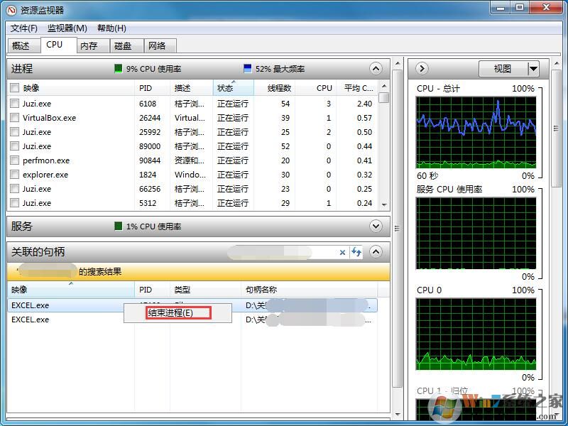 2、然后在该窗口中,切换到cpu 页签,然后在 关联的句柄中,输入文件名或文件夹名称(如xiuchufang.com),按下回车键,即可查找到被占用的进程;