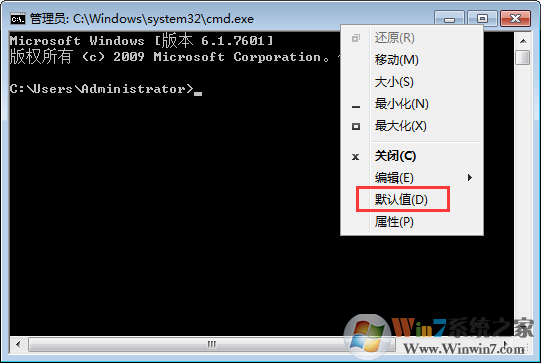 1、在命令提示符的窗口边上右击,点击“默认值”,如下图;