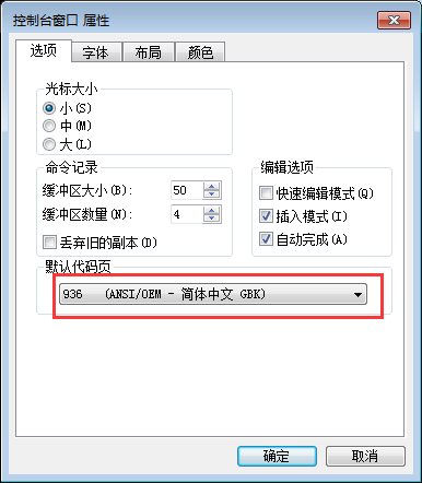 2、 这时会出现控制台窗口 属性的界面,我们在默认代码页,这里选择为“936(ANSI/OEM -简体中文 GBK)”