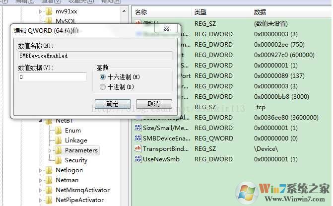 3、在右边空白处右击新建“QWORD(64位)值”,然后重命名为“SMBDeviceEnabled”,再把这个子键的值改为0。