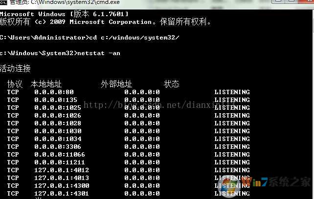 cmd命令行中输入“netstat -an”查看端口状态,但如果直接输入会无法识别netstat命令。所以要“cd c:/windows/system32/”切换,然后再执行