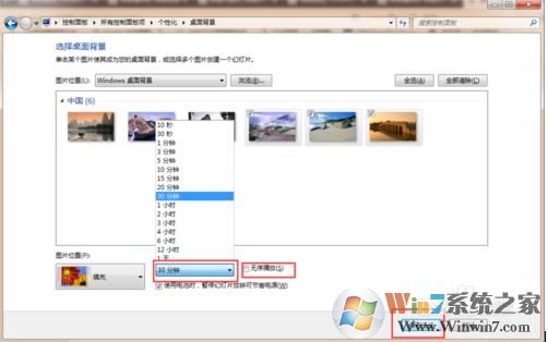 6、然后主要的就是设置更换壁纸的间隔时间了,我们可以设置的小一些,比如你的电脑刚好用于展示,那么可以设置几秒换一张壁纸,当然,如果是在使用的电脑,建议半小时换一次就可以了。