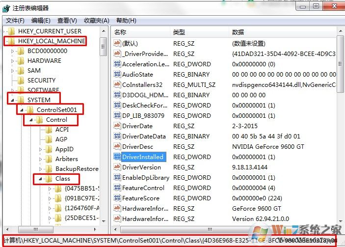 2、在注册表上依次展开HKEY_LOCAL_MACHINE \ SYSTEM \ ControlSet001 \ Control \ Class \ {4d36e968-e325-11ce-bfc1-08002be10318}项;