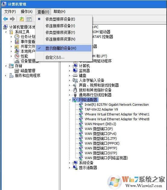 3、同时时也可以在设备管理器中删除,在“设备管理器”中先在“查看”菜单中选择“显示隐藏的设备”,然后在网络适配器中可以看到很多6to4 Adapter或者isatap Adapter的隧道适配器,删掉所有这些,可是一个个删实在是太痛苦,所以还是用上面的方法吧。最后CMD里ipconfig命令下,如果只有以太适配器和无线适配器(如果你有无线网卡),那么就说明你已经删除干净了,重启电脑即可。