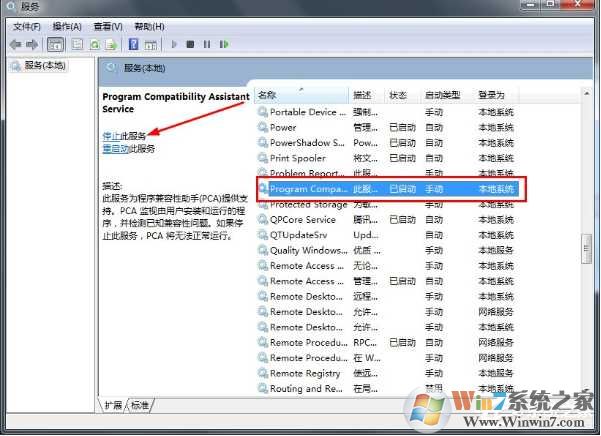 4、在出来的列表中,找到这个东东“Program Compatibility Assistant Service”。其实也就是程序兼容性助手的选项。点击这个东东,在左侧找到“停止”此项服务,点击停止即可。