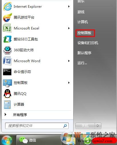 1、首先打开桌面右下角的开始菜单,选择控制面板选项;