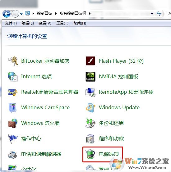 2、然后在可控制面板的调整计算机的设置下选择点击“电源选项”项;