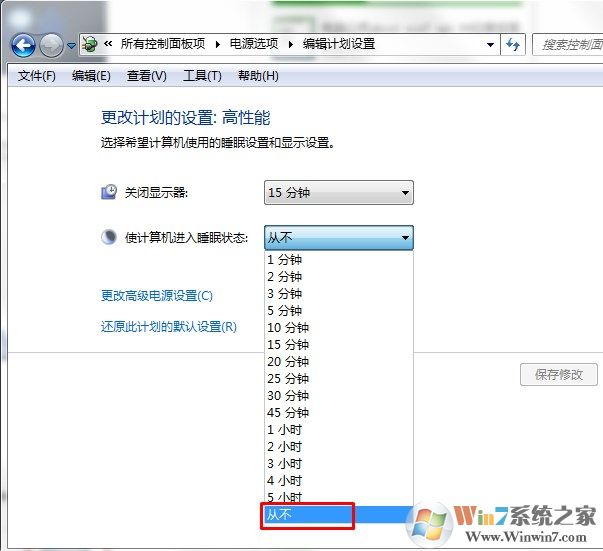 4、接着在计算机进入休眠状态中选择“从不”,最后点击“保存修改”按钮即可。