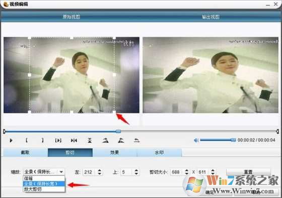3、然后再点击视频编辑,然后裁剪视频。把方框拉成正方形大小差不多的,再点击下面的缩放,选择全景(保持长宽)如图所示。最后点击确定输出视频。