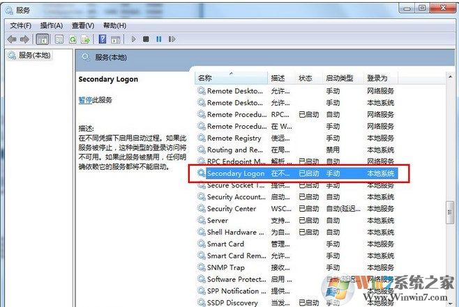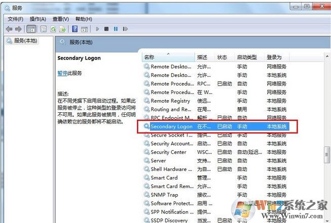 总结:Secondary Logon服务在win7系统中是很重要的,所以不要轻易的去关闭此项服务