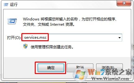 2、在“运行”命令对话窗口中的“打开”输入框中,输入“services.msc”命令,然后再点击“确定”按钮。:
