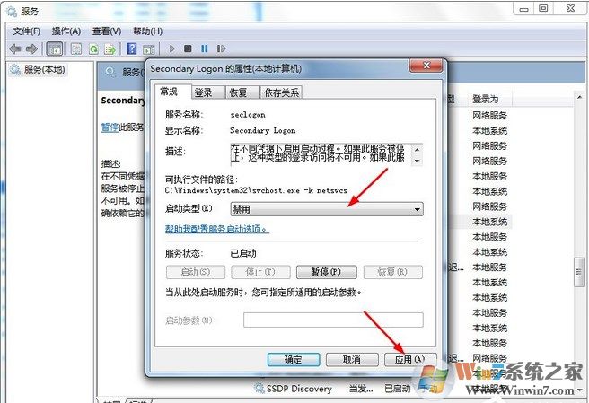 5、在打开的“Secondary Logon 的属性”对话窗口中,在启动类型选项中选择“禁用”选项,在点击“应用”按钮。