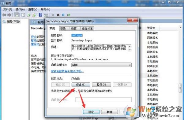 6、这个时候再依次点击“停止--》确定”按钮。最后关闭服务对话窗口并重新启动计算机即可。