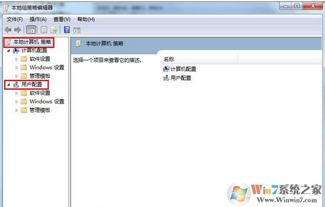 2、我们在本地组策略编辑器窗口的本地计算机 策略下找到用户配置,并点用户配置前面的小三角展开;