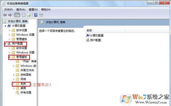 3、我们在用户配置的展开项中找到:管理模板,在管理模板下找到:系统,并左键单击:系统;
