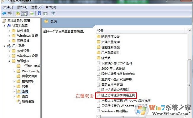4、我们在系统右边的窗口的选项列表中,找到:阻止访问注册表编辑工具,并左键双击:阻止访问注册表编辑工具;