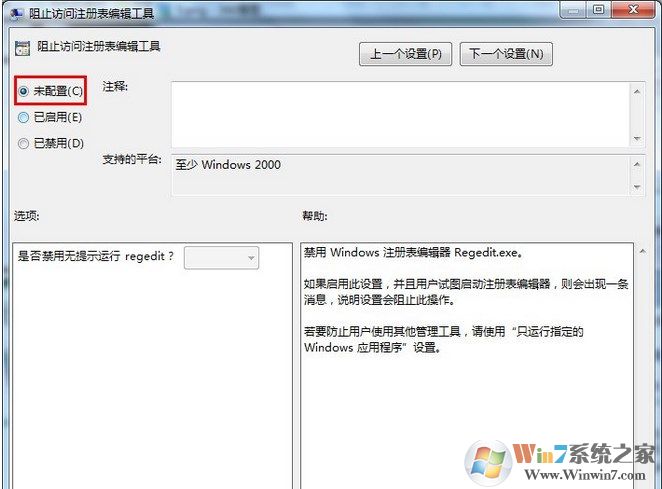 5、在弹出的阻止访问注册表编辑工具窗口中,将系统默认设置未配置更改为:已启用,然后点击:确定,注册表被锁定;