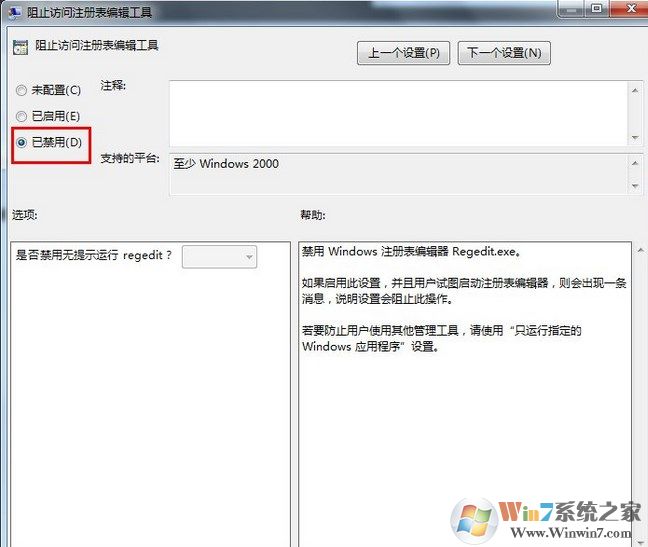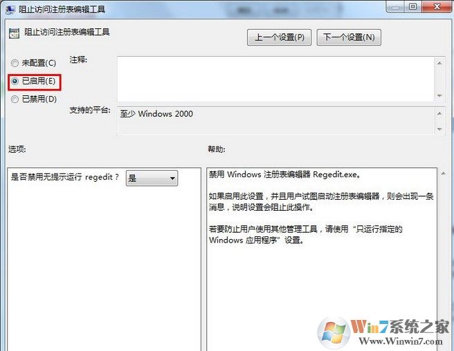 7、如果我们要使用注册表时,可以在阻止访问注册表编辑工具窗口中,把已启用更改为:已禁用,然后点击:确定,就可以解除锁定注册表编辑器;