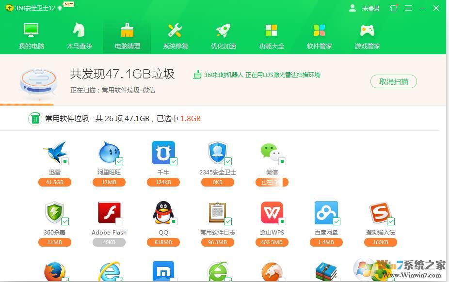 由于软件很多,有时我们可以使用简单的方法,就是使用360等软件来进行垃圾清理,可以把很多缓存和临时文件清理掉