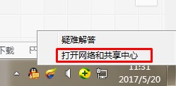 1、在屏幕右下角的任务栏窗口中找到网路连接图标,然后右键点击,选择打开网络和共享中心。
